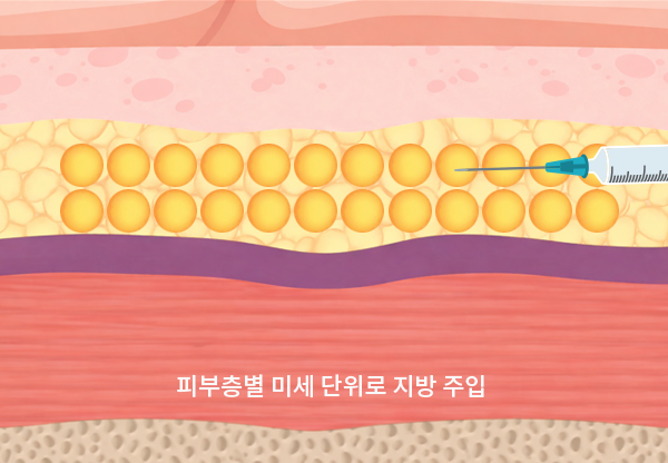 피부층별로 층층히 미세 단위로 지방을 주입합니다.